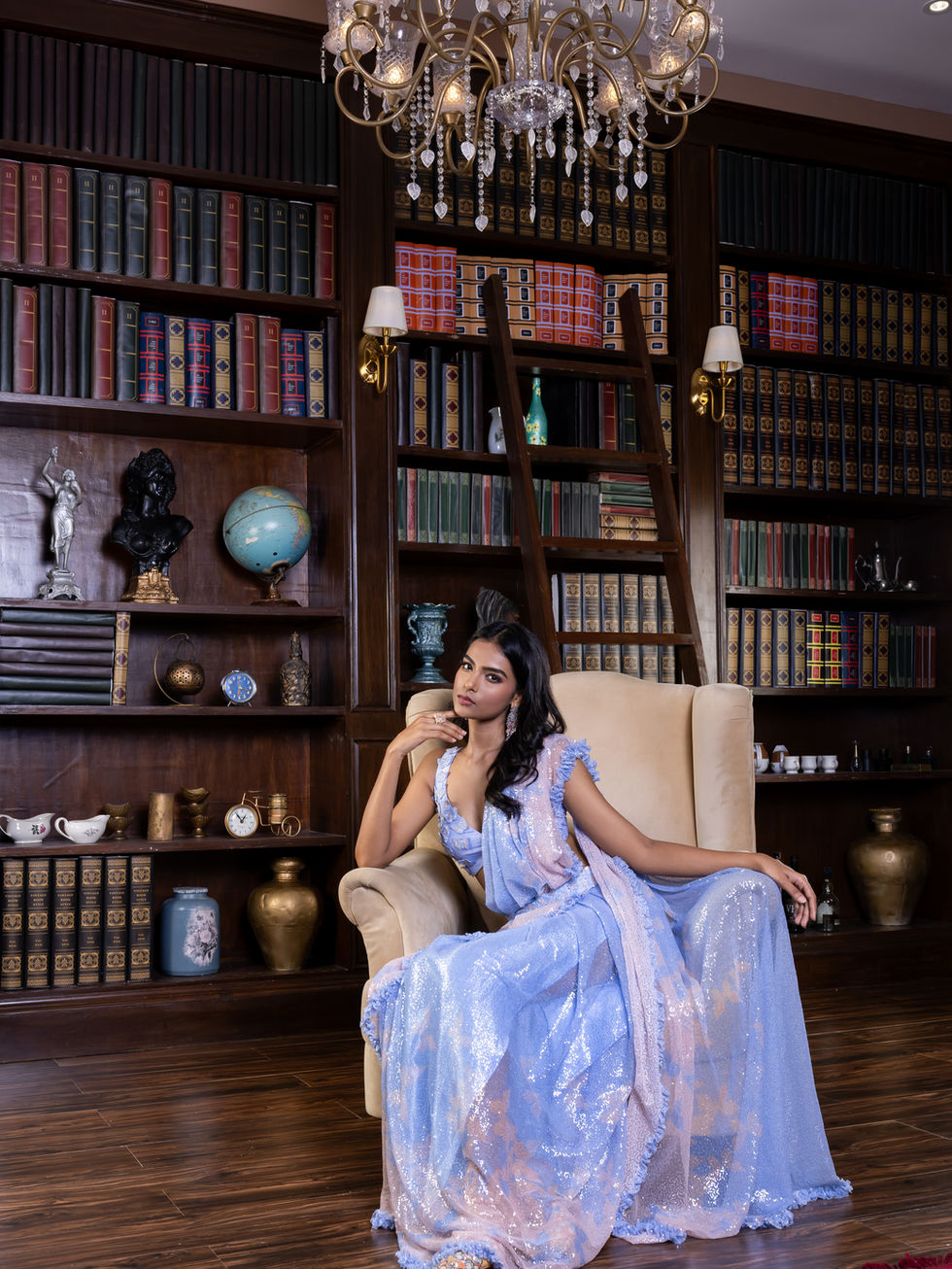 Unveil a vision of elegance with Adviraa’s powder blue ready-to-wear saree paired with a meticulously hand-embroidered blouse.